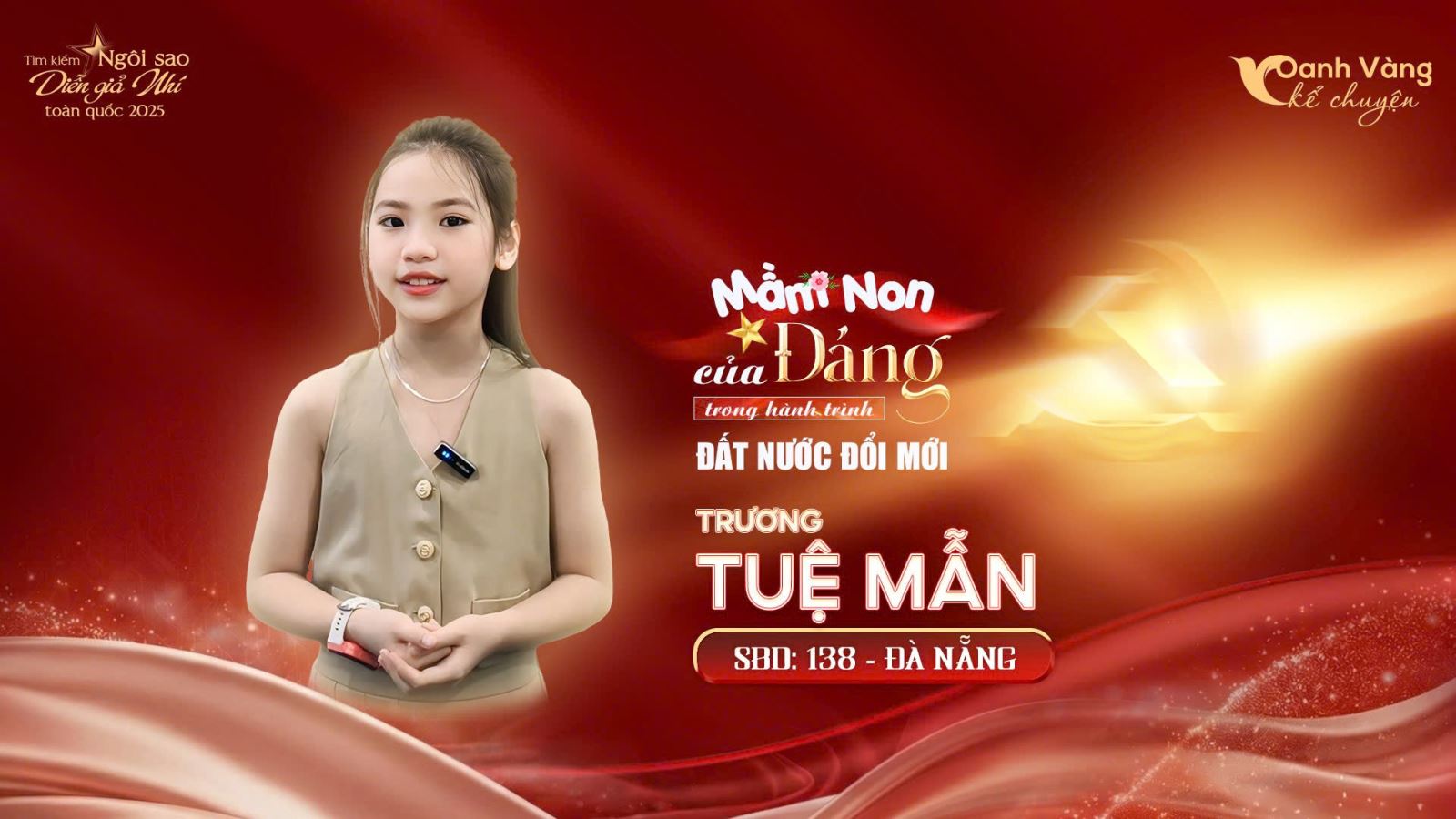 Trương Tuệ Mẫn (SBD 138, Đà Nẵng) gây ấn tượng tại cuộc thi bởi lối kể chuyện giàu cảm xúc cùng phong thái điềm tĩnh, tự tin trước ống kính. Giọng kể có chiều sâu, cách thể hiện tinh tế giúp câu chuyện trở nên gần gũi và dễ tạo sự đồng cảm với người nghe. Sự chuẩn bị chỉn chu trong hình ảnh cùng khả năng biểu đạt linh hoạt đã góp phần làm nổi bật màu sắc riêng của Tuệ Mẫn, qua đó khẳng định sự nghiêm túc và tiềm năng của bạn trên hành trình chinh phục vòng Chung kết.