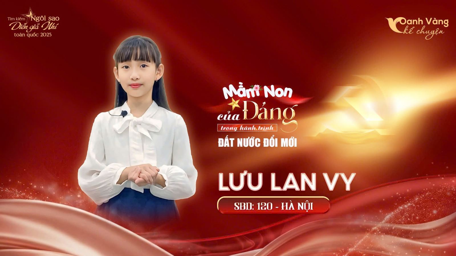 Lưu Lan Vy (SBD 120, Hà Nội) gây ấn tượng bằng phong cách kể chuyện điềm tĩnh và tinh tế, thể hiện sự chững chạc trong cách tiếp cận câu chuyện. Với giọng kể nhẹ nhưng rõ, Lan Vy lựa chọn lối thể hiện không phô trương, tập trung vào cảm xúc và chiều sâu nội dung. Trong suốt hành trình tham gia, bạn cho thấy sự kiên trì rèn luyện và thái độ nghiêm túc, từng bước hoàn thiện phần thể hiện của mình. Việc góp mặt tại vòng Chung kết là dấu mốc ghi nhận nỗ lực bền bỉ của thí sinh đến từ Hà Nội.