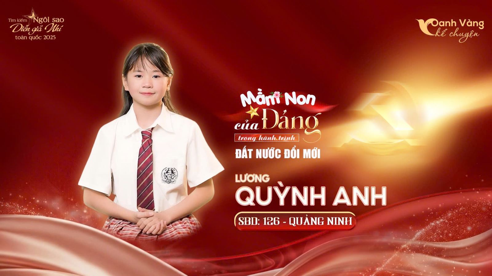 Lương Quỳnh Anh (SBD 126, Quảng Ninh) là một trong những thí sinh để lại dấu ấn qua giọng kể rõ ràng, mạch lạc và phong thái tự tin. Sự nghiêm túc trong cách thể hiện cùng khả năng dẫn dắt câu chuyện ổn định đã giúp Quỳnh Anh từng bước khẳng định mình trong suốt các vòng thi, cho thấy sự bền bỉ và tinh thần cầu tiến đáng ghi nhận.