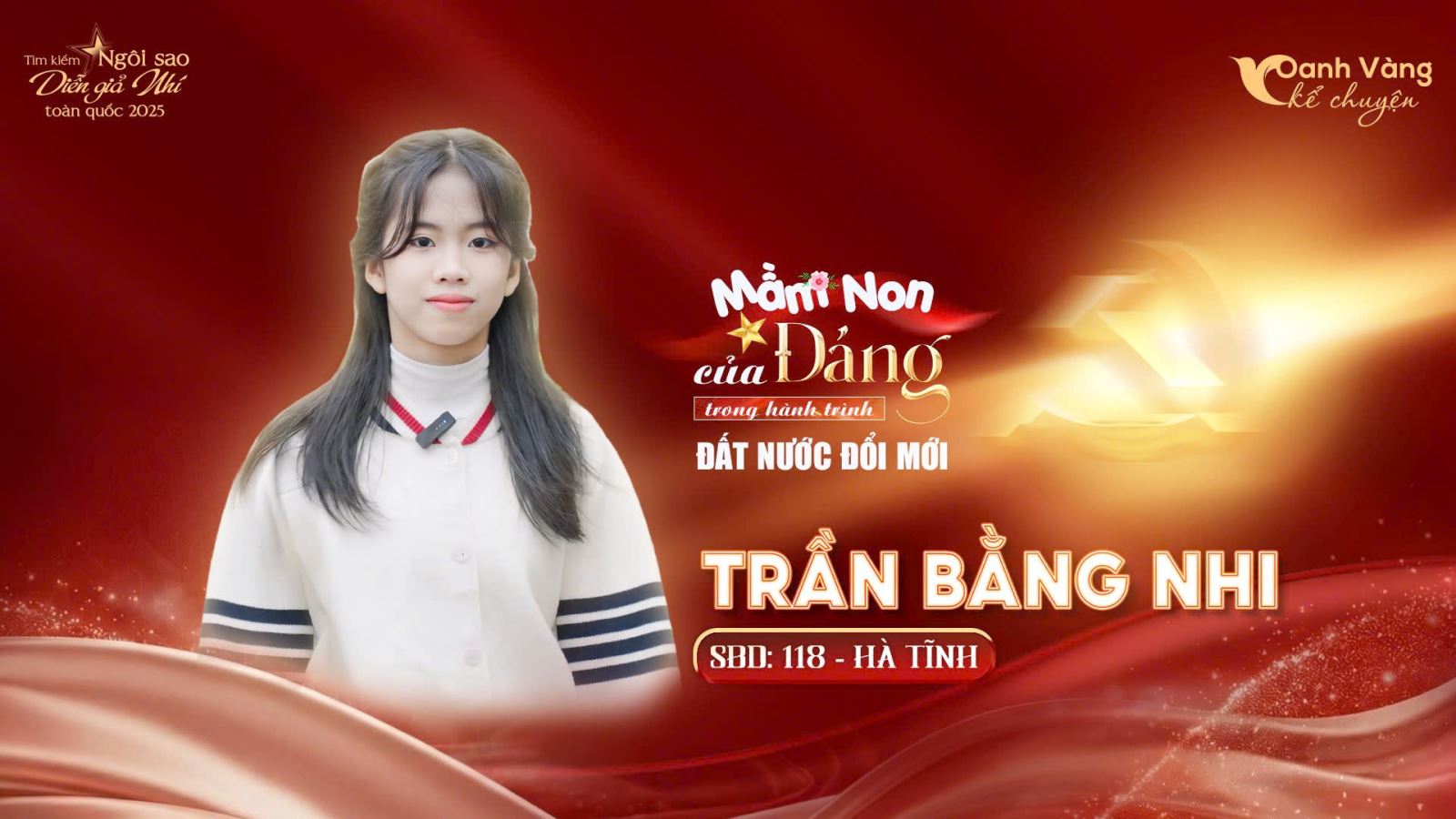 Trần Bằng Nhi (SBD 118, Hà Tĩnh) gây chú ý qua cách kể chuyện điềm tĩnh, giọng nói rõ ràng và khả năng giữ mạch cảm xúc ổn định. Phần thể hiện của Bằng Nhi cho thấy sự nghiêm túc trong cách tiếp cận nội dung, cùng nỗ lực duy trì phong độ qua từng vòng, góp phần tạo nên dấu ấn riêng trên hành trình đến vòng chung kết.