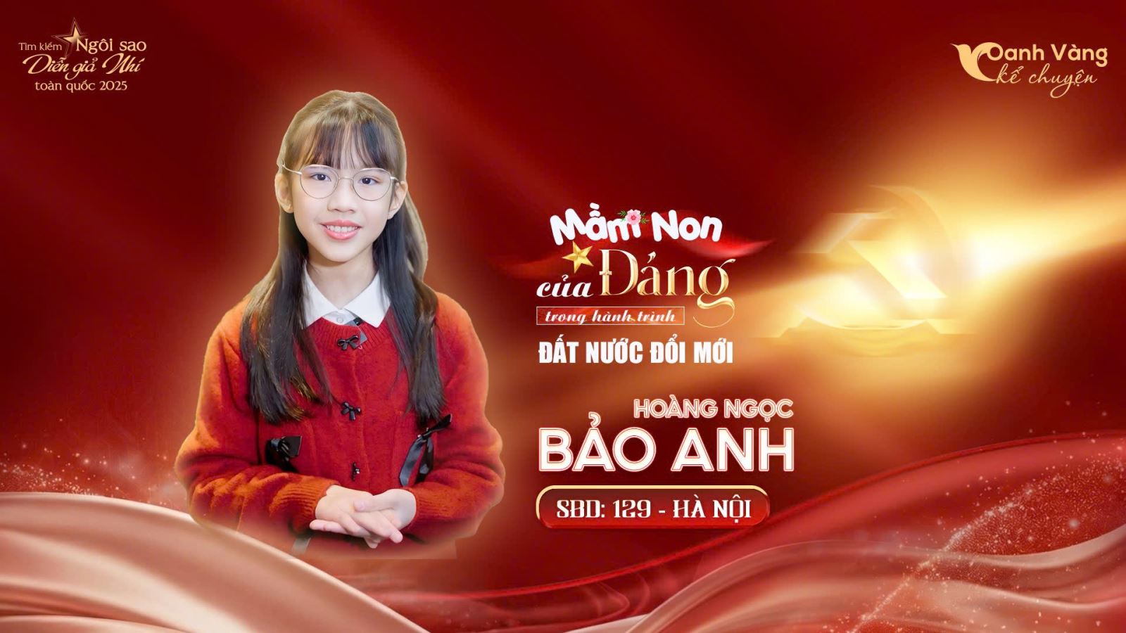 Hoàng Ngọc Bảo Anh (SBD 129, Hà Nội) thể hiện sự nhạy cảm trong cách tiếp cận câu chuyện, nổi bật ở khả năng làm chủ biểu cảm và tạo chiều sâu cho từng chi tiết. Phần dự thi của bạn cho thấy sự quan sát tinh tế và sự đầu tư nghiêm túc trong quá trình chuẩn bị, từ cách xây dựng nội dung đến cách thể hiện trước ống kính. Trên hành trình tham gia cuộc thi, Bảo Anh từng bước khẳng định sự tiến bộ rõ rệt, vượt qua những thử thách của hình thức thi trực tuyến để góp mặt trong danh sách thí sinh vào vòng Chung kết.