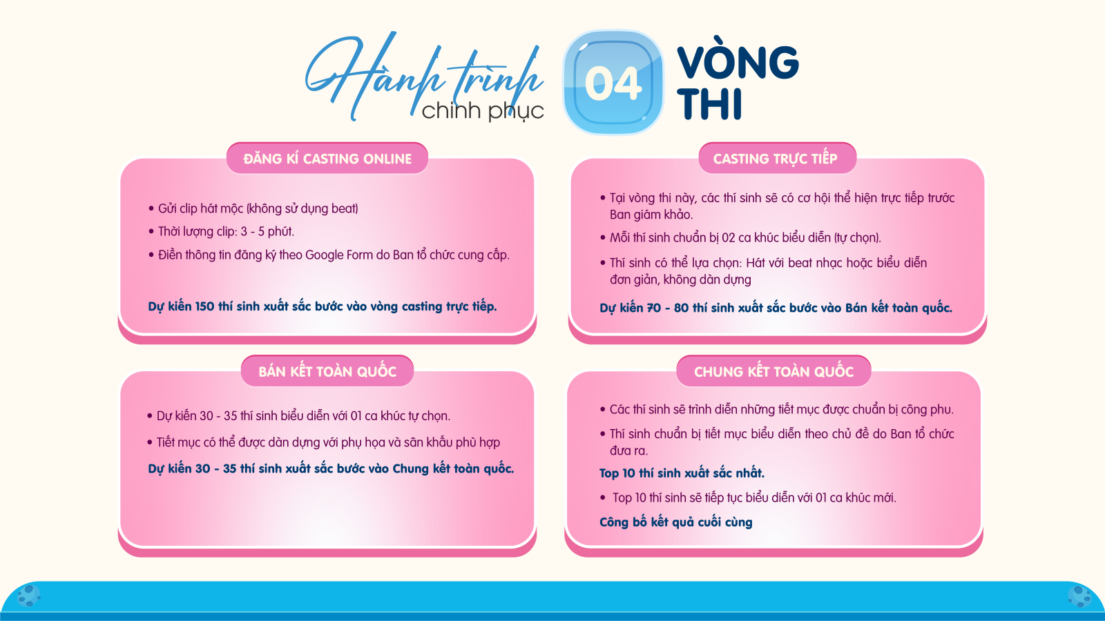 + Mỗi thí sinh chuẩn bị 02 ca khúc biểu diễn (tự chọn)